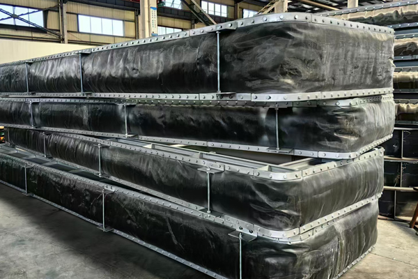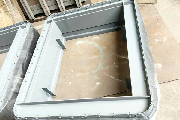 本文中所展示的圖片是我們翔盛環(huán)保科技公司近期正在為山東客戶(hù)生產(chǎn)制作的一批矩形非金屬補(bǔ)償器(矩形非金屬膨脹節(jié))。非金屬補(bǔ)償器通常由纖維織物蒙皮(硅膠為紅色、氟膠為黑色)與管道接口形狀相同的金屬框架、以及其它的結(jié)構(gòu)件所組成。